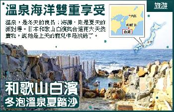 溫泉,是冬天的良品;海灘,則是夏天的派對場。日本和歌山白濱集合這兩大天然寶物,一方面在街上也能嗅到溫泉味飄香,另一方面她的海濱鋪滿又幼又白的細沙。此外,還有別具特色的岩石地貌及洞窟避風港,說她是上天的寵兒準是沒錯了。