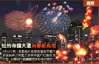 (美國)2月16日晚,美國紐約地標性建築帝國大廈頂端再次亮起了象徵中國的紅黃兩色綵燈,以慶祝中國農曆虎年新年的到來。