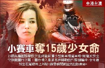 (香港)香港週三(2月17日)發生小型賽車(Go-Kart)奪命意外。15歲英籍國際學校女生到龍鼓灘小型賽車場駕車時,疑違反安全守則戴圍巾上陣,圍巾捲入車尾高速轉動的引擎鏈輪中,女生猶如坐在駕駛席上吊般,頸骨瞬間被猛然扯斷喪命。