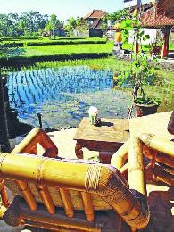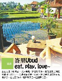 在峇里Ubud,我們3個人坐在簡單木台邊,像其他客人一樣,方向一致地面對稻田,像欣賞電影一樣,欣賞陽光曬在金黃稻米上的好看景色。