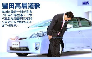 豐田車廠社長豐田章男23日承認,車廠過往的擴展速度可能過快,他又再次就車輛問題導致人命傷亡一事道歉。目前已身在美國的豐田章男前一天投書美國媒體,承認在過去數年間,豐田過份注意技術問題,明顯對顧客的聲音沒及時認真傾聽。豐田章男說,近來普銳斯和雷克薩斯等主要車型的大規模召回事件對豐田來說是一種恥辱,公司要認真汲取教訓,從根本上改變經營方式。