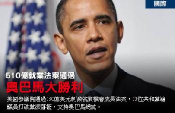 (美國)美國參議院週三(2月24日)通過150億美元刺激就業機會成長法案,獲得13位共和黨籍議員打破黨派藩籬,在這項法案上支持民主黨籍的奧巴馬總統。