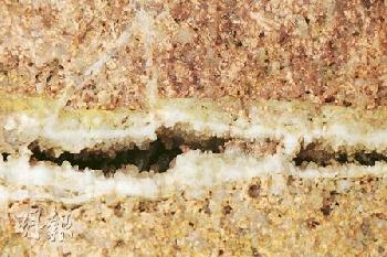 除了海岸地貌,細心觀察岩石,瞭解它們的故事,欣賞岩石也頓時變得有趣。在岩石堆中,偶然可看到一條乳白色的物質藏在岩石裡,那就是石英,葉恒榮說:“石英溶液是由地底較熱的位置,經花崗岩岩基(積聚在地殼深層的巨大熔岩體)內較弱的裂紋或節理,向地面湧出,大部份未到地面時已冷卻凝固,形成花崗岩中的石英岩脈。”石英岩脈是帶有一條條柱狀的石英體,呈半透明的乳白色,小部份呈透明狀態的,樣子似曾相識,原來它就是我們常見的水晶。