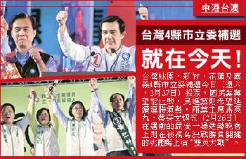 (台灣)台灣桃園、新竹、花蓮及嘉義4縣市立委補選今日(週六,2月27日)投票,國民黨冀望能止敗,民進黨則希望延續連勝氣勢,兩黨主席馬英九、蔡英文週五(2月26日)在選前的最後一場造勢晚會上則在被視為決戰勝負關鍵的桃園縣上演“雙英大戰”。另一方面,由於選舉結果將牽動年底五都選戰的佈局,兩黨的五都對決人選也將明朗化。