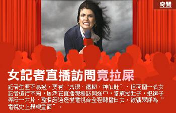 突然,傳來一下怪聲,女記者臉色一變,輕輕驚呼,囁嚅地說:“發生了小意外。”她退了兩步後,似乎再也忍不住,轉身飛奔離開。