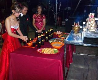 基於對大伯爺、二爺、三爺和其他神明的敬崇,他決定從冷甲孝龍宮,將3樽神像送到安順婚宴現場,供奉在婚宴前方,供品包括“黑狗啤”。