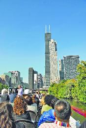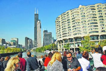 • 乘遊船欣賞全美最高的Willis Tower(圖中最高建築)及芝加哥河岸不同年代的大廈,乃芝加哥必遊項目。(圖:香港明報)