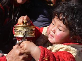 專注地抓著轉經筒的小孩。(圖:大馬星洲日報)