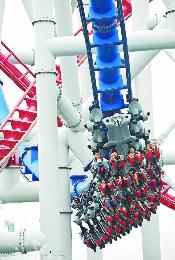 “變形金剛”遊戲對面,就是USS的王牌、全球最高的雙軌過山車。(圖:香港明報)