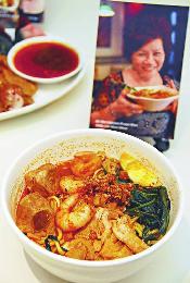 林美妹的檳城蝦麵,湯底以蝦殼熬成,香辣鮮美(5新元)。(圖:香港明報)