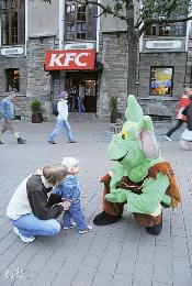 扎科帕內步行街上有不少跨國食店和促銷產品的“公仔人”。(圖:香港明報)