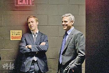 《The Ides of March》的主角是飾演競選團隊年輕副手的賴恩哥斯寧(Ryan Gosling,左),飾演州長的佐治古尼其實佔戲不多,當然因為他還要兼顧導演的重責。(資料圖片)(圖:香港明報)