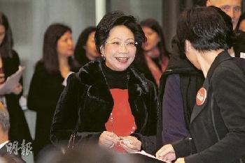 特首參選人梁振英臨時缺席活動,令太太唐青儀(左)單刀赴會,她強調丈夫誠信“完全沒問題”,不擔心風波會拖垮其選情。(圖:香港明報)