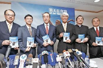 香港特首參選人唐英年(左3)提出2016年取消區議會委任議席,但卻拒絕回應功能組別存廢。圖左起為立法會議員林大輝、唐英年競選辦公室秘書長何鑄明、唐英年、競選辦高級顧問任志剛、葉澍劏及鄭慕智。(圖:香港明報)