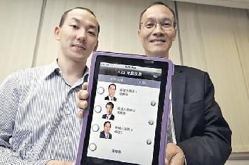 港大民意研究計劃總監鍾庭耀(右)將在3月23日舉辦民間全民投票,供年滿18歲的市民選出心儀特首。民研計劃科技經理馬晉彥(左)表示,他們已研發流動應用程式,供市民在載有iOS的流動裝置投票,目前正等候AppsStore審批。(圖:香港明報)