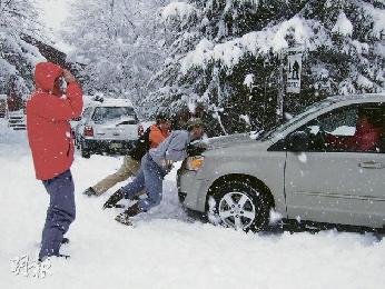 車輪陷進雪溝中,要旅舍職員幫忙。(圖:香港明報)