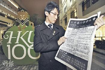 港大學生會罕有地斥資逾10萬元,3月12日在香港8份報章刊登全版廣告,質疑梁振英涉黑金政治,要求梁回應。港大學生會會長陳冠康解釋,聲明針對“黑金政治”一說,強調“對事不對人”,不涉及港大學生會支持任何特首候選人。(圖:香港明報)