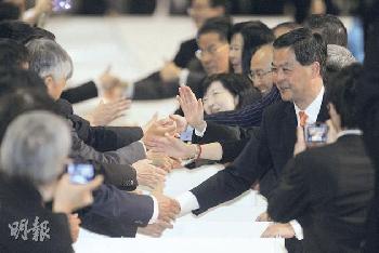 梁振英(右)當選特首後,除與唐英年團隊握手,他與梁辦成員亦隔著圍板與一眾選委握手,歷時十多分鐘,有選委等候握手時拿出相機留影。(圖:香港明報)