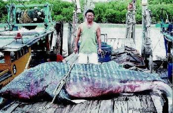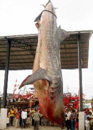 2009年11月10日,雪蘭莪適耕莊漁民捕獲一頭長約20呎,一噸多重的鯨鯊魚(俗稱蛤蟆鯊),引起注目。(圖:大馬星洲日報)