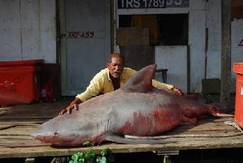 2009年10月26日,柔佛邊佳蘭(Pengerang)漁夫捕獲大魚1.8公尺的三角頭人臉鯊,俗稱“畚鯊”。這類鯊魚的魚鰭最值錢,其肉質也佳。(圖:大馬星洲日報)