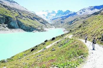 馬特宏峰山徑沿河谷逆流而上,逐步高升,至一個小村落時拐右登一段陡坡,再折反方向在山腰上朝采爾馬特鎮延伸。開始時馬特宏峰在我們前方引路,後來她和我們玩捉迷藏,躲在山後不見人,直到我們在山腰離她漸遠,她才又重新露面。兩座雪山前後護持我們,谷裡的水壩和水庫在眾多高峰圍困下顯得微不足道。