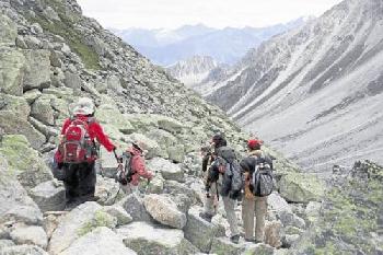 好不容易走完那亂石嶙峋的陡坡,登上了海拔2665米的“阿爾卑斯之窗”山口。約莫10分鐘後,美英和晉中也上了來。晉中走得較吃力,因他前幾天還感冒,尚在復原中。桑妮婭一直嫌我們走得慢,說我們這團人是她出道以來最慢者。她這話後來又重複了一遍。