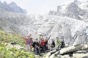 上了年紀的老朋友,個個鬥志軒昂,不忘在冰川前留影。 (圖:馬來西亞南洋商報)