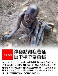 “點頭症”(nodding disease)是一種病因不明的怪病,患者多為5歲至16歲的少年兒童,主要分佈於烏干達、蘇丹、剛果及坦桑尼亞。 “點頭症”會使患病兒童持續出現“點頭”症狀。雖然不感到疲倦,但患者病發時卻會一直低著頭、雙眼緊閉,呈睡著狀態。病情惡化後,患者會突然跌倒或失去意識。結果有的孩子因而跌落火堆燒死或水中溺斃。 “點頭症”的其他症狀還包括失去認知能力、發育受阻,部份患者會出現類似腦癇的抽搐,有的因無法進食而餓死,或是營養不良而受其他病毒感染致死。 部份患者曾接受磁力共振掃描,顯示出其腦部出現不正常腦電波,但病因始終未明,目前僅能靠藥物控制病情。據世界衛生組織官員指出,有父母把病童視為負累,而將其拋棄。(資料來源:互動百科/馬來西亞中國報) 中英對照: ‧Kampala:【地名】坎帕拉(烏干達首都) 延伸閱讀: ‧尼泊爾‧無聲緊急狀態