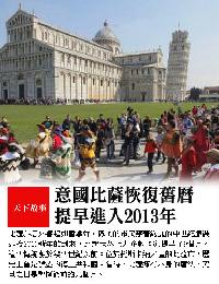 (意大利)比薩斜塔(Leaning Tower of Pisa)外響起如雷掌聲,歡愉的市民穿著絢麗的中世紀服裝迎接2013年的到來,比世界上大多數國家提早了九個月。