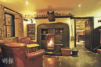 甫進入Wild Boar Inn,暖暖壁爐先映入眼簾。火爐上更掛起了點題的野豬頭。(圖:香港明報)