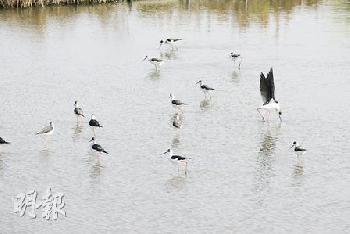 在塱原漫步,不時看到許多雀鳥,圖中的黑翅長腳鷸正在池塘覓食。(圖:香港明報)