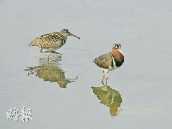 彩鷸(學名Rostratula benghalensis,圖右)常出現於水田或池畔等濕地。它們是相當害羞的鳥兒,習慣在早晨、黃昏或夜間活動,喜歡躲在草叢中。(圖:香港明報)