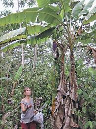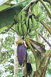 哪棵蕉樹可以收割,留意蕉底的“香蕉花”(紫紅色實為苞葉,保護著真正的小花),香蕉夠成熟它就會脫落。(圖:香港明報)