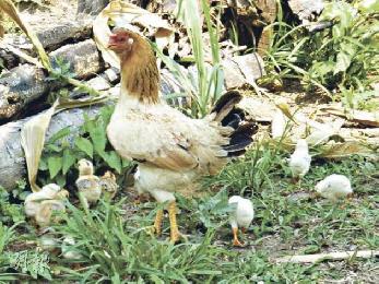 在園裡除了豹以外,雞也是這大家庭的重要成員,在森林裡養雞的好處是只需平常一半分量的飼料。一來多的是蟲,什麼叫得出名的草蜢蜈蚣蠍子(!),以至叫不出名的綠的黑的大的小的飛的爬的蟲,都是雞們的美點,另外我們吃剩的木瓜皮和籽、削出來的紅蘿蔔皮、要丟的外層老椰菜,什麼廚餘我們不吃的東西,牠們都愛吃得不得了。園裡養了一隻大公雞,三隻母雞,牠們各自帶著由一隻到十隻小雞,我們在的時候雞共有17口。因為不需要太多雞,有時就吃雞蛋。第一次在雞舍裡取蛋時真樂壞了,那晶瑩潔白的蛋竟還是暖的,感覺太新鮮了!