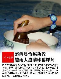 (越南)儘管犀角粉的療效未經醫學證實,越南癌症患者卻普遍視它為仙丹妙藥,非法購入犀牛角,以至於威脅到世界野生犀牛的存亡。犀牛角所含的成份與人體指甲蛋白質並無二致,在越南卻可叫價每盎司上千美元。居高不下的需求量導致犀牛群浴血南非,被盜獵數目屢創新高。