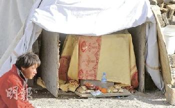 這個粗糙的薄木箱是玉樹當地人民為安放阿福遺體準備的。箱子放在孤兒院外的空地,以一個臨時搭建的小帳棚蓋著木箱,以擋風吹雨打。(圖:香港明報)