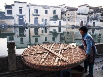 宏村的古村落,當地婦女正在曬茶葉,背景古牆倒映。(圖:馬來西亞星洲日報)