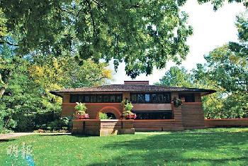 當芝加哥擁有世界第一座摩天大廈,成為摩廈的建築樂園時,萊特(Frank Lloyd Wright1867-1959)卻逆向思考,開創以橫向發展、被視為20世紀美國重要建築風格的Prairie Style(草原風格)。“在這之前,建築概念有英式鄉村草屋(English cottage house)、法國莊園(French chateau)、德國城堡(German castle)等,但從沒有美國風格的概念。”導賞員說。