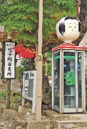 鳴子溫泉的電話亭,也安上木偶頭。(圖:香港明報)