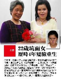 (中國)5月17日上午,曾轟動一時的世界首例“坑面女”患者王娜,在西安四醫大口腔醫院接受了最後一次治療。歷時四載的分階段治療和愛心接力,使飽受面部畸形之苦的王娜,徹底告別了困擾她22年的“坑面”,恢復了一個花季少女的正常容顏。