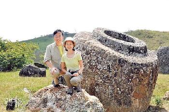 張文光與太太在平原最大的石缸「王者之杯」前合照。杯重6噸,杯大人小,有王者之氣。(圖:張文光)