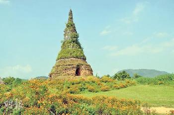 豐塔被黑旗軍搶掠一空,塔門像黑洞,塔身被剝落,但歲月為它裝身,黃花草地,藍天白雲,莊嚴佛塔添上自然之美。(圖:香港明報)