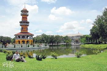 • 拉瑪五世建造的觀景台周圍綠草如茵,最宜像胡慧沖(圖)那樣坐下來細想。(圖:香港明報)