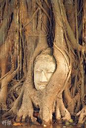 • 大城王朝遺蹟中的古廟Wat Phra Mahathat外有一個被菩提樹根包圍的佛像頭,是大城最標誌性的影像之一。(圖:香港明報)