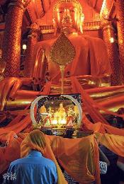 泰國的三寶公廟相當於我們的天后廟,有很多座,而且同樣保佑航海安全。至於此三寶公廟有何特別?除了19米高的金佛,就是胡慧沖稱為“黃袍加身”的祭拜儀式。廟祝待廟內“儲”夠善信,就會把一條長幾十米的黃紗掛在佛像身上,繼而拋下給善信披在頭上,讓善信禱告一會兒後廟祝就會把黃紗收回,整個過程大概只有約5分鐘,絕對是“千奇百趣”!為表誠意,善信可以“買”黃紗,費用140泰銖起。(香港明報)