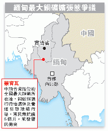 (緬甸)緬甸北部城鎮蒙育瓦(Monywa)一個中緬合資銅礦被指非法強徵土地擴建和污染環境,遭示威者圍堵5個月。警方11月29日日趁民主派領袖昂山舒吉到訪前,於凌晨以水炮、催淚彈及疑為磷彈的神秘武器強行清場,導致最少50人受傷,另有6名示威者被捕。昂山舒吉事後前往衝突地點視察,承諾會協助以和平方式解決紛爭。《環球時報》則發表社論,指摘西方勢力煽動,令中國在緬投資一再觸礁,警告長此下去將令中緬兩國兩敗俱傷。