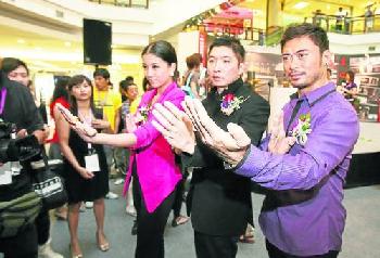 《葉問前傳》演員陳嘉桓(左)、樊少皇(右)與陳賢武(中)擺出詠春拳的招式。(圖:大馬光明日報)