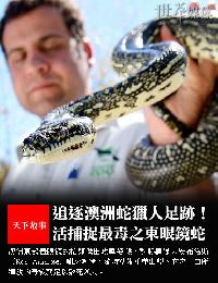 (澳洲)澳洲東部毒眼鏡蛇抬頭做出攻擊姿態,對爬蟲獵人安布洛斯(Rob Ambrose)呲牙咧嘴,隨時準備重拳出擊。它咬一口所釋放的毒液就足以致死20人。