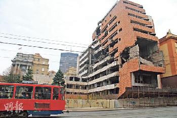 • 市中心其中一幢被北約炸毀的軍方辦公大樓,十多年來還保留了這模樣。(圖:香港明報)