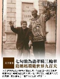 (中國)為了讓媽媽有機會看看外面的世界,74歲的王一民以三輪車載著99歲的媽媽環遊世界900天。他的孝行獲得中國廣大人民的表揚,更被譽為是“這個時代最後的孝子”。